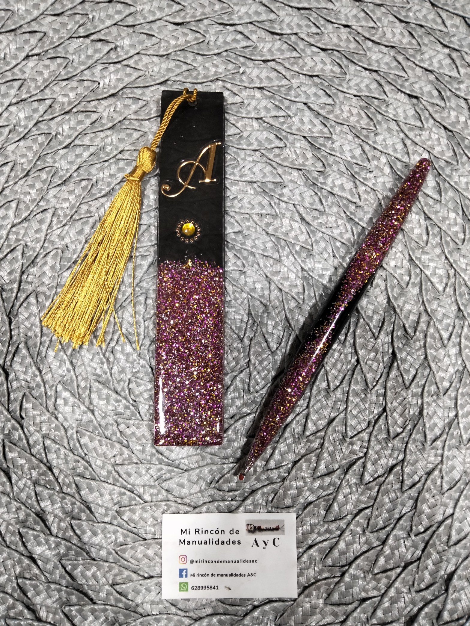 Pack marca páginas y bolígrafo, en tono negro y brillantina dorada, rosa y plata. Con inicial A.
